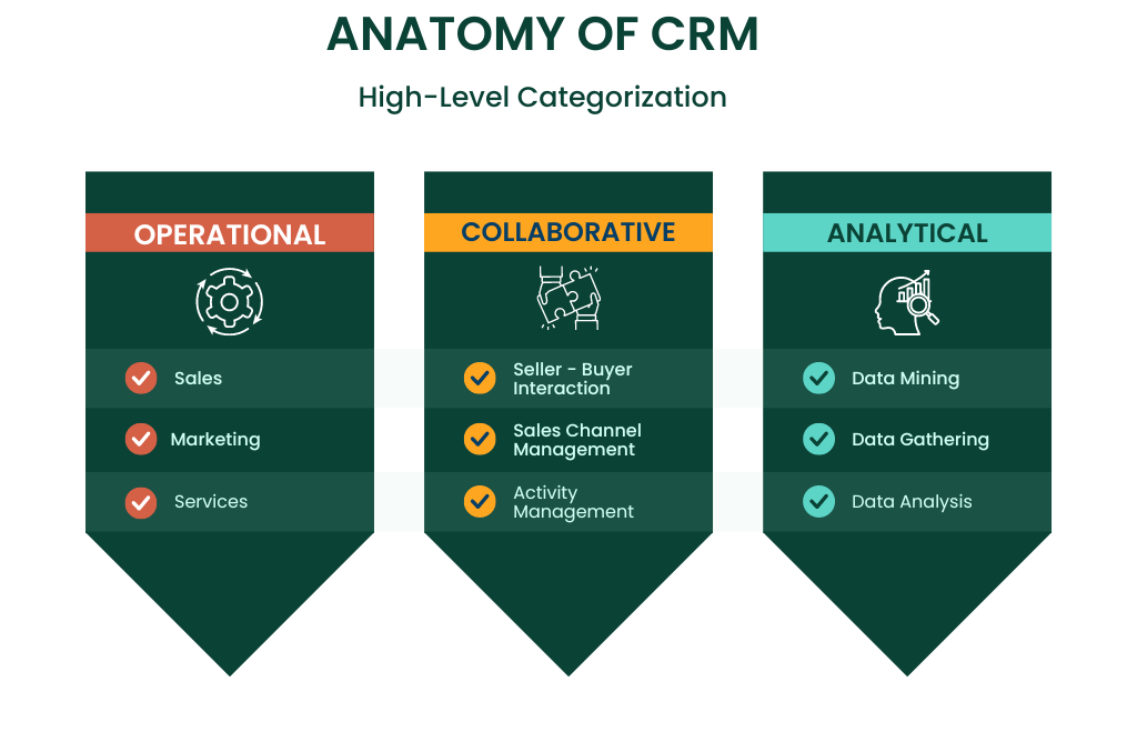 If CRM is a Platform with three pillars, then here are those with their constituents. We assume the constituents as the features of a CRM